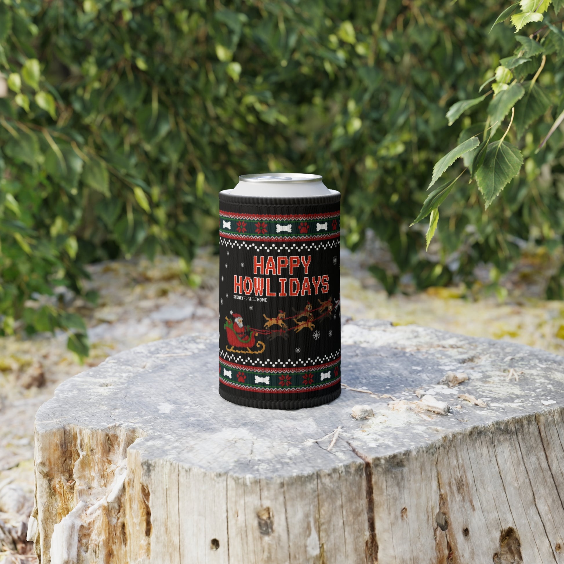 Keep your drink cool and your Christmas spirit warm with our Happy Howlidays stubby holder! Featuring Santa in his sleigh being pulled by a team of festive pups in a classic “ugly Christmas sweater” style design, this is the paw-fect accessory for summer barbies, holiday parties, and Chrissy gatherings.